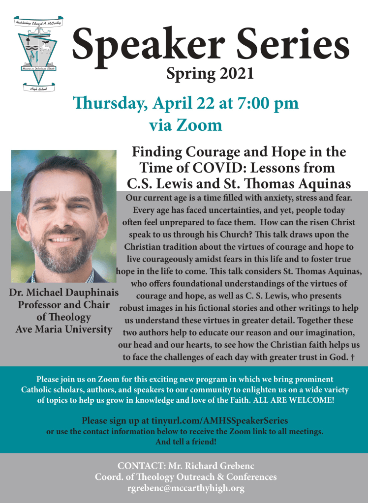 My school, Archbishop Edward A. McCarthy High School in south Florida, is honored and privileged to welcome Dr. Michael Dauphinais, Professor and Chair of Theology at Ave Maria University, to our Spring Speaker Series. Due to the pandemic, this entire series is being conducted via Zoom. I invite you to learn more by checking out the flyer below. I hope this interesting and relevant talk will prompt you to sign up and join us tomorrow evening at 7:00pm.