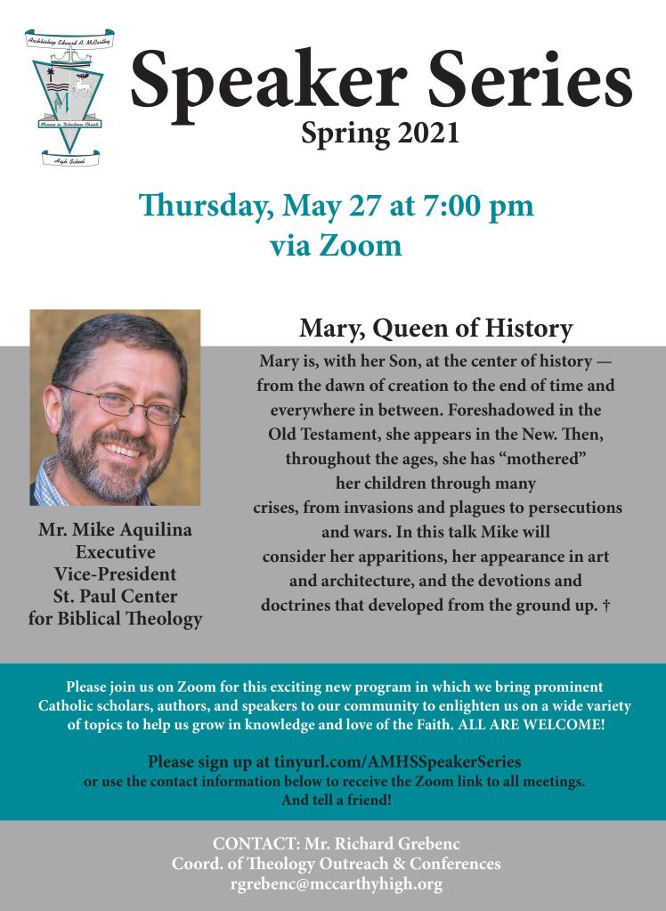 My school, Archbishop Edward A. McCarthy High School in south Florida, is honored and privileged to welcome Mike Aquilina, Executive Vice President of the St. Paul Center for Biblical Theology, to give the final talk in our Spring Speaker Series, on the Virgin Mary in history (check out his recently published related book, that I can highly recommend, History’s Queen, here).. Due to the pandemic, this entire series is being conducted via Zoom. I invite you to learn more by checking out the flyer below. I hope this fascinating talk will prompt you to sign up and join us this evening at 7:00pm Eastern (sign up as indicated in the flyer or just email me at rgrebenc@mccarthyhigh.org if interested in attending). This is interactive, so you will have an opportunity to ask questions personally or via chat.