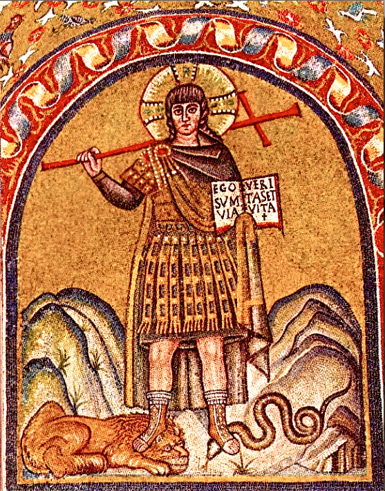 This fifth century mosaic, inspired by Psalm 91, is located in the Archiepiscopal chapel in Ravenna. Christ is represented as a chivarlic Emperor, holding not a sword, but a cross over his shoulders because His kingdom is of an utterly radical life-giving and evil-conquering nature, unlike the kingdoms of the Fallen World System. The book He holds open that reads, “I am the way, the truth and the life.”